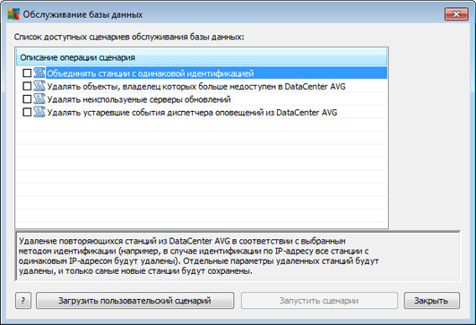Обслуживание базы данных центра данных AVG осуществляется очень легко благодаря предварительно настроенным сценариям, доступным в меню Инструменты/Обслуживание базы данных.
